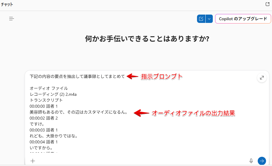 Wordのトランスクリプト(全文)をCopilot(またはChatGPT/GeminiでもOK)にコピペして、次のように指示します。